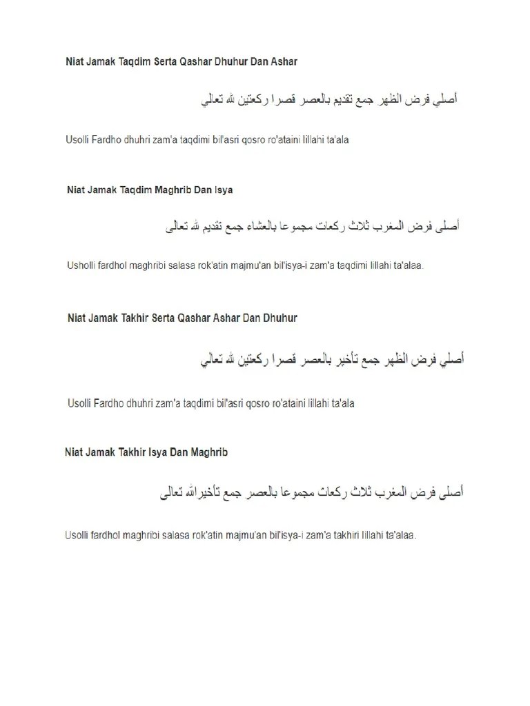 Ushollii fardlozh maghribi thalaatha raka'aatin . Begitu juga maghrib dengan isya. Niat solat jamak takhir dzuhur dan ashar yakni:. Sholat jamak adalah menggabungkan dua sholat di . Salat dzuhur dan ashar, dikerjakan di waktu ashar.